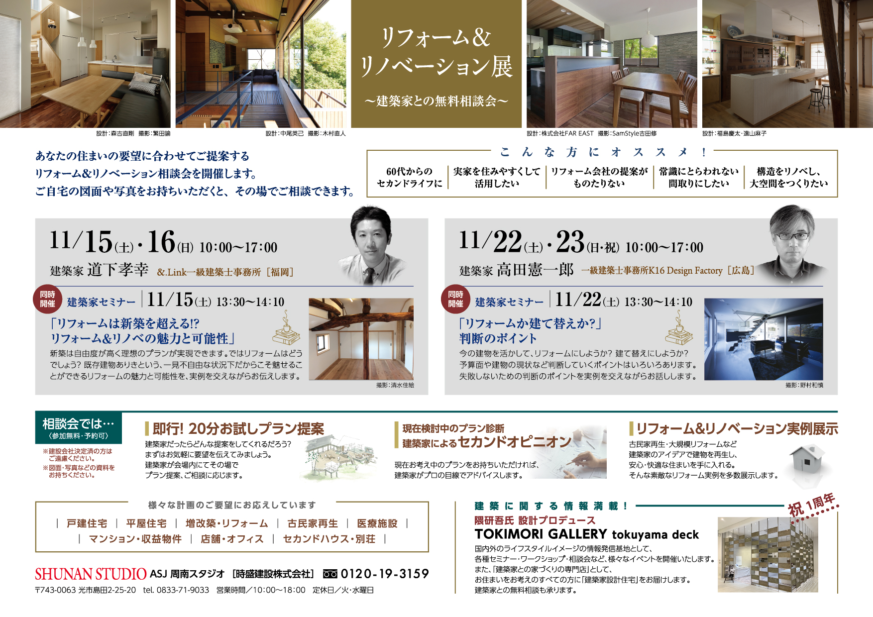 11/15(土)、16(日)、22(土)、23(日)の期間中、TOKIMORI GALLERYにてリフォーム&リノベーション展を開催いたします。